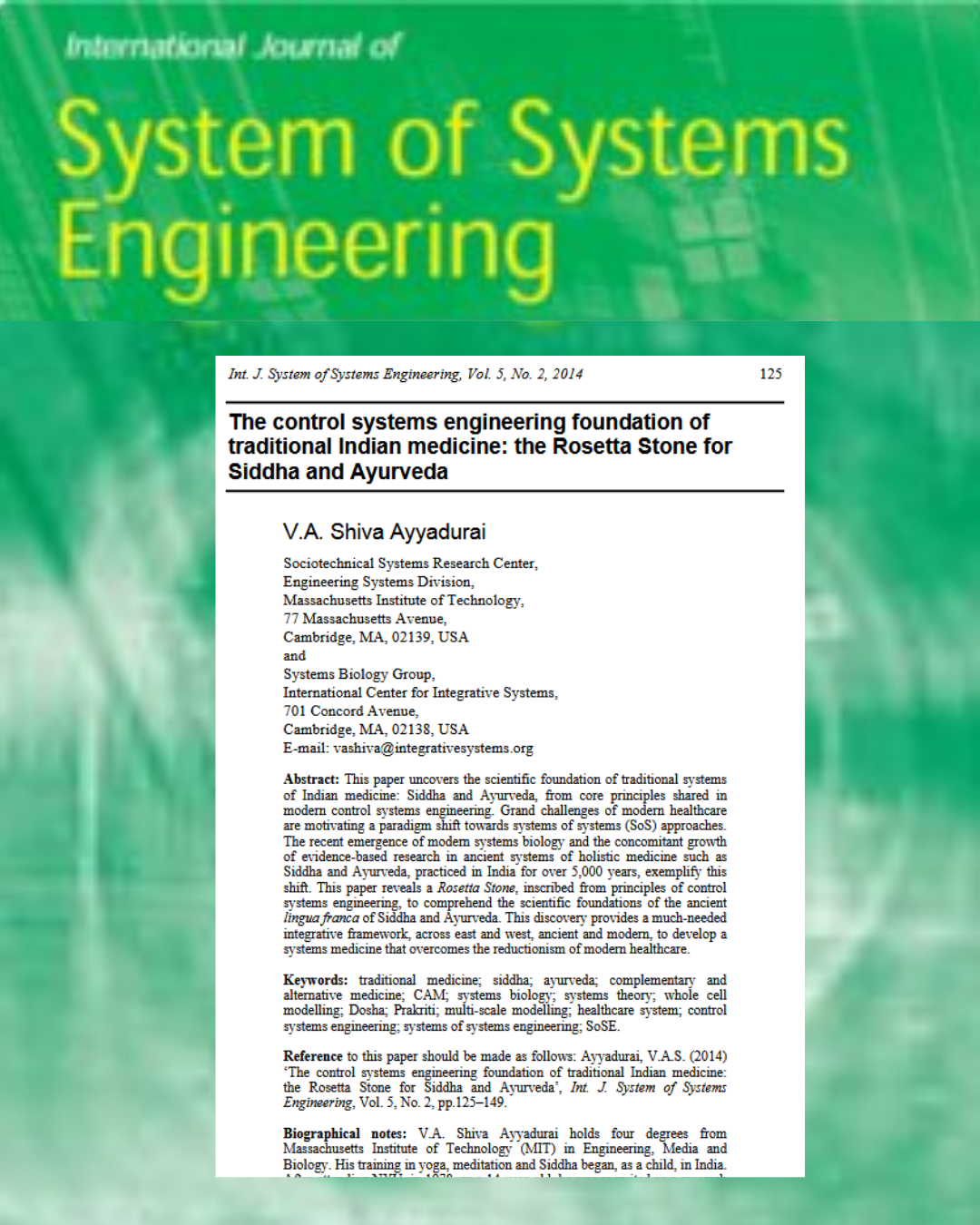 Building on this conceptual mapping, the author argues that modern reductionist biomedical approaches are limited in their ability to account for the dynamic, multi-scale interactions that characterize living systems, and that integrative systems science provides a formal methodology for unifying traditional qualitative insights with quantitative models. The paper suggests that viewing health and disease through this combined lens could enhance both clinical practice and research, offering a pathway to personalized medicine that respects individual variability in physiology and response to treatment. In doing so, it positions the Siddha and Ayurvedic frameworks as early forms of systems thinking, presciently emphasizing balance, feedback, and network interdependence long before these concepts were formalized in modern biology.